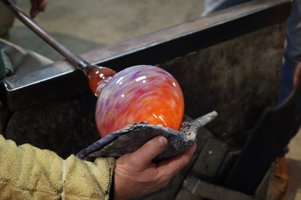 Wet newspaper is all that separates scorching hot glass and the artist's hand.